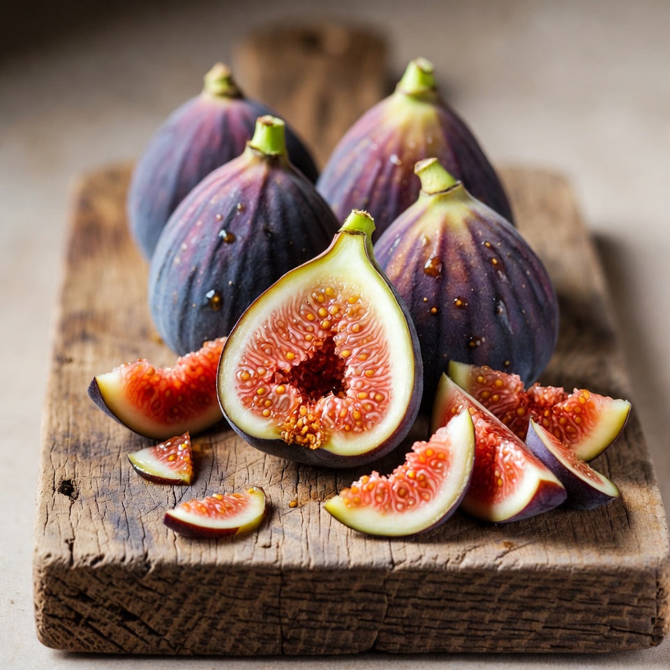 Fresh figs are sliced and displayed on a wooden cutting board. Whole figs surround the cut pieces, showing their pink flesh.