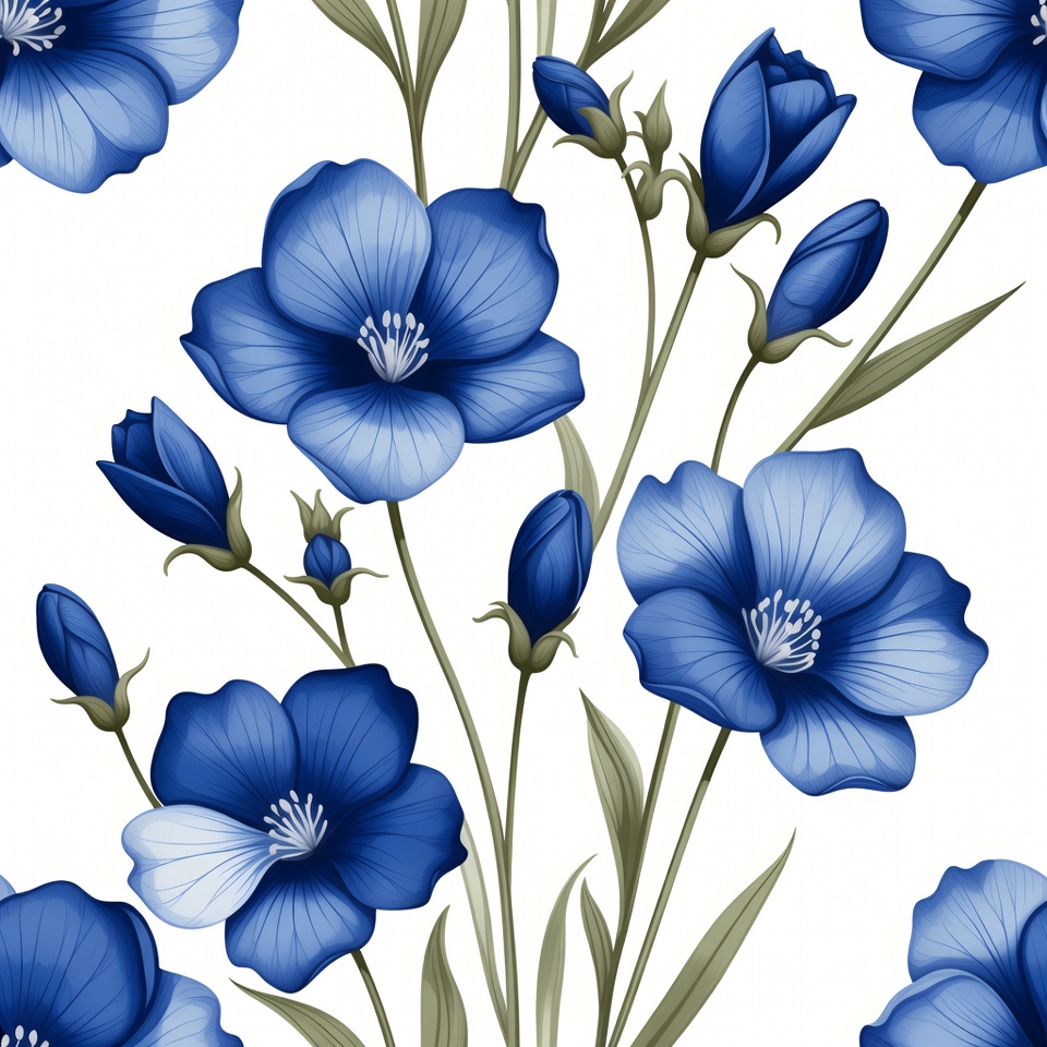 Design displays blue flowers on a white background. The flowers vary in size and arrangement, featuring detailed petals and leaves.