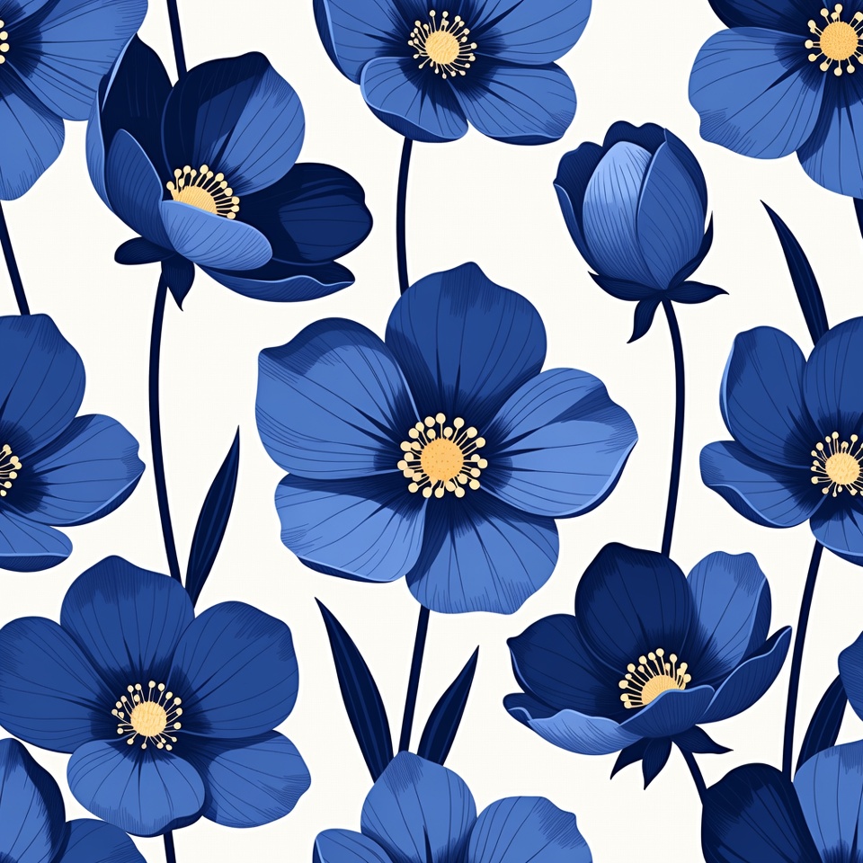 Bright blue flowers with yellow centers grow tall on a light background. The design features various blooms and stems scattered evenly.