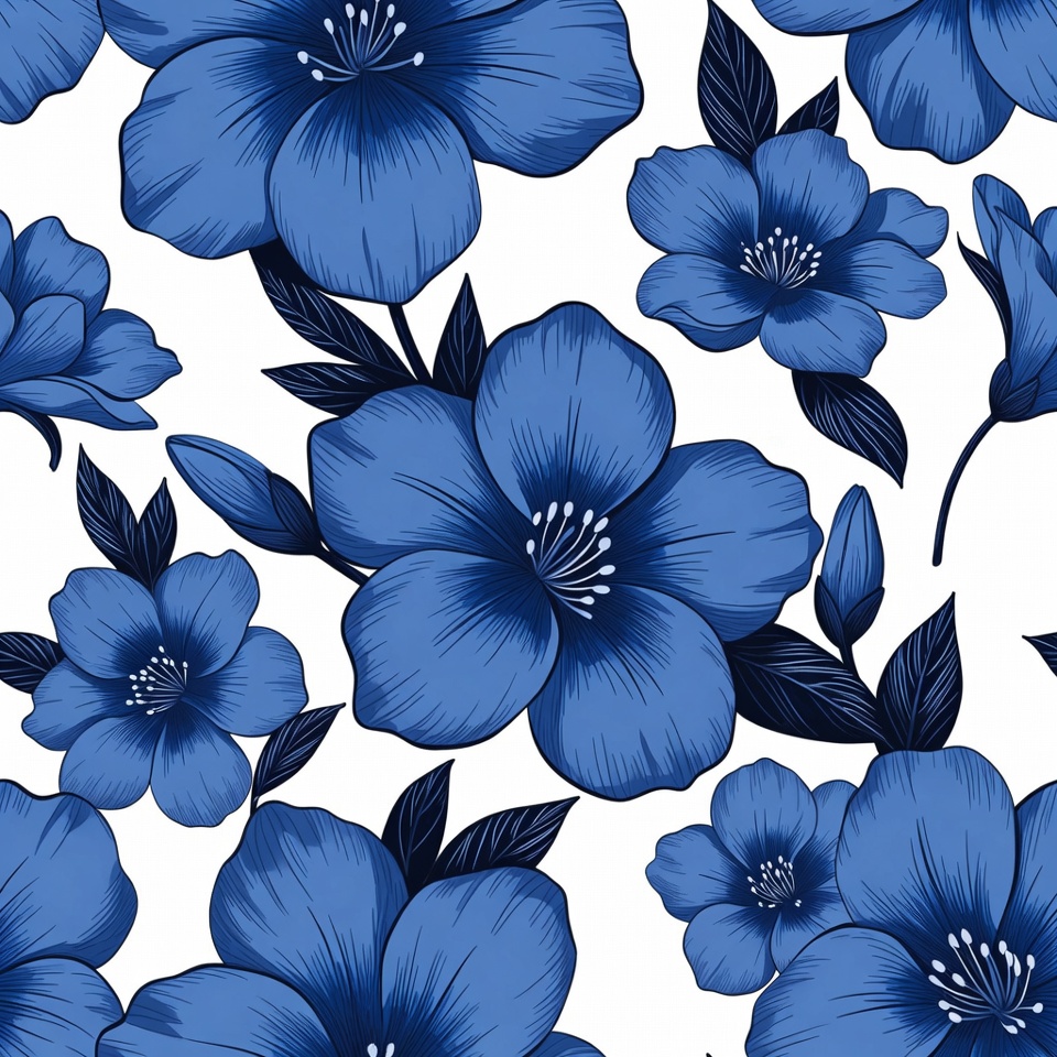 Flowers with blue petals are scattered across a white background, showcasing various sizes and shapes with green leaves.