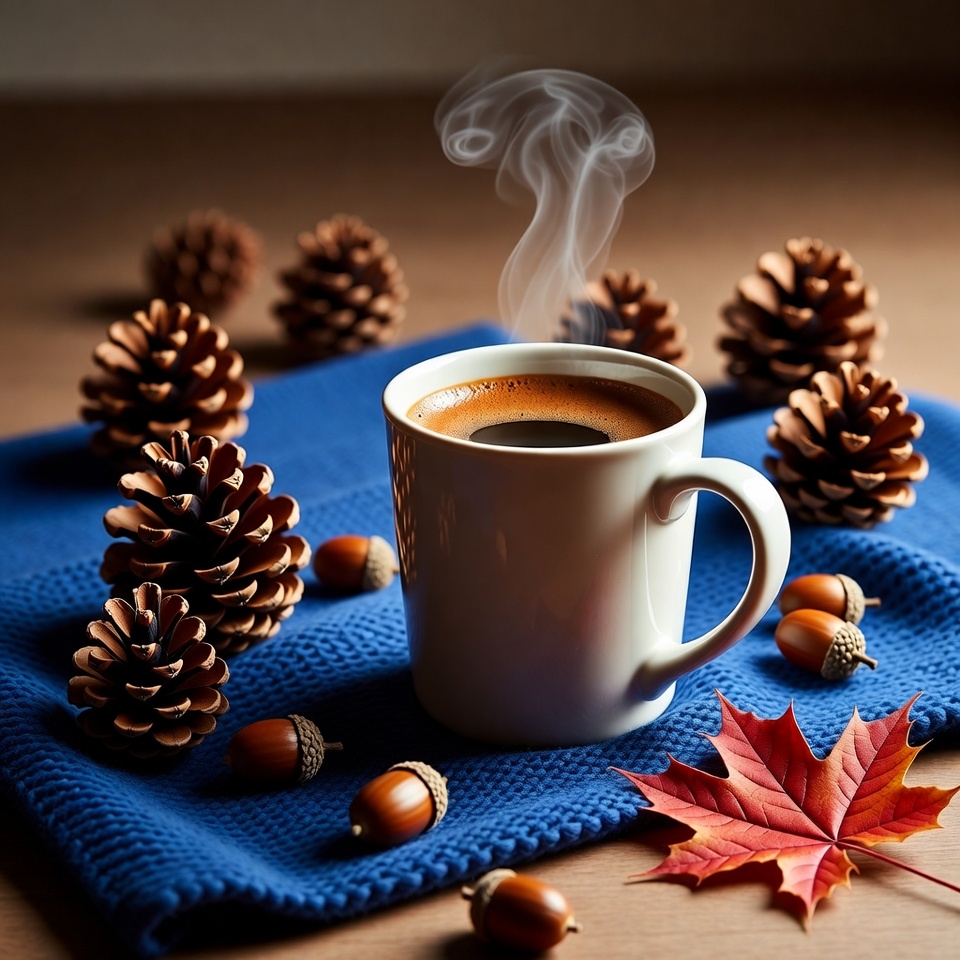 A white mug with hot coffee sits on a blue cloth surrounded by pinecones, acorns, and a red maple leaf in an autumn setting.
