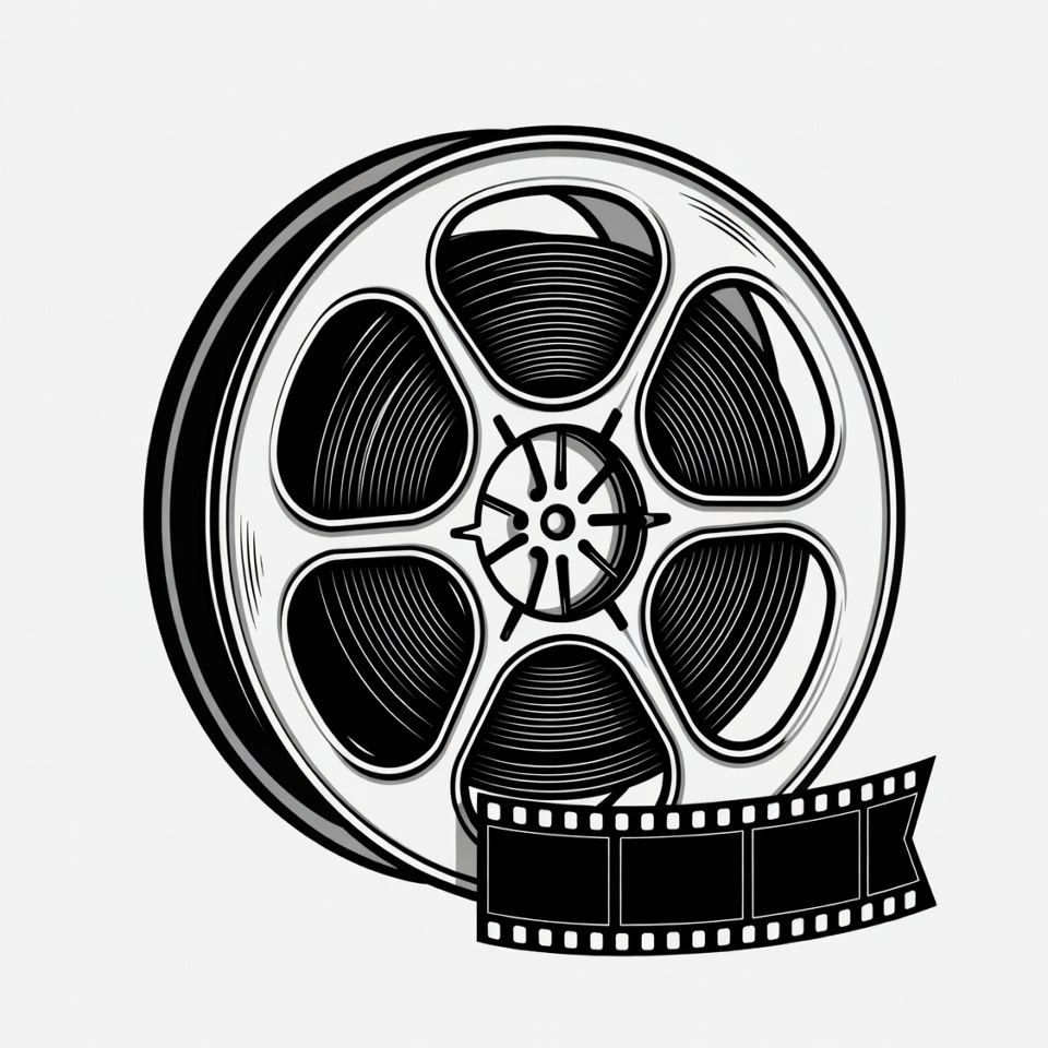A film reel sits on a flat surface with a film strip attached. The reel has multiple circular openings and shows various film layers.