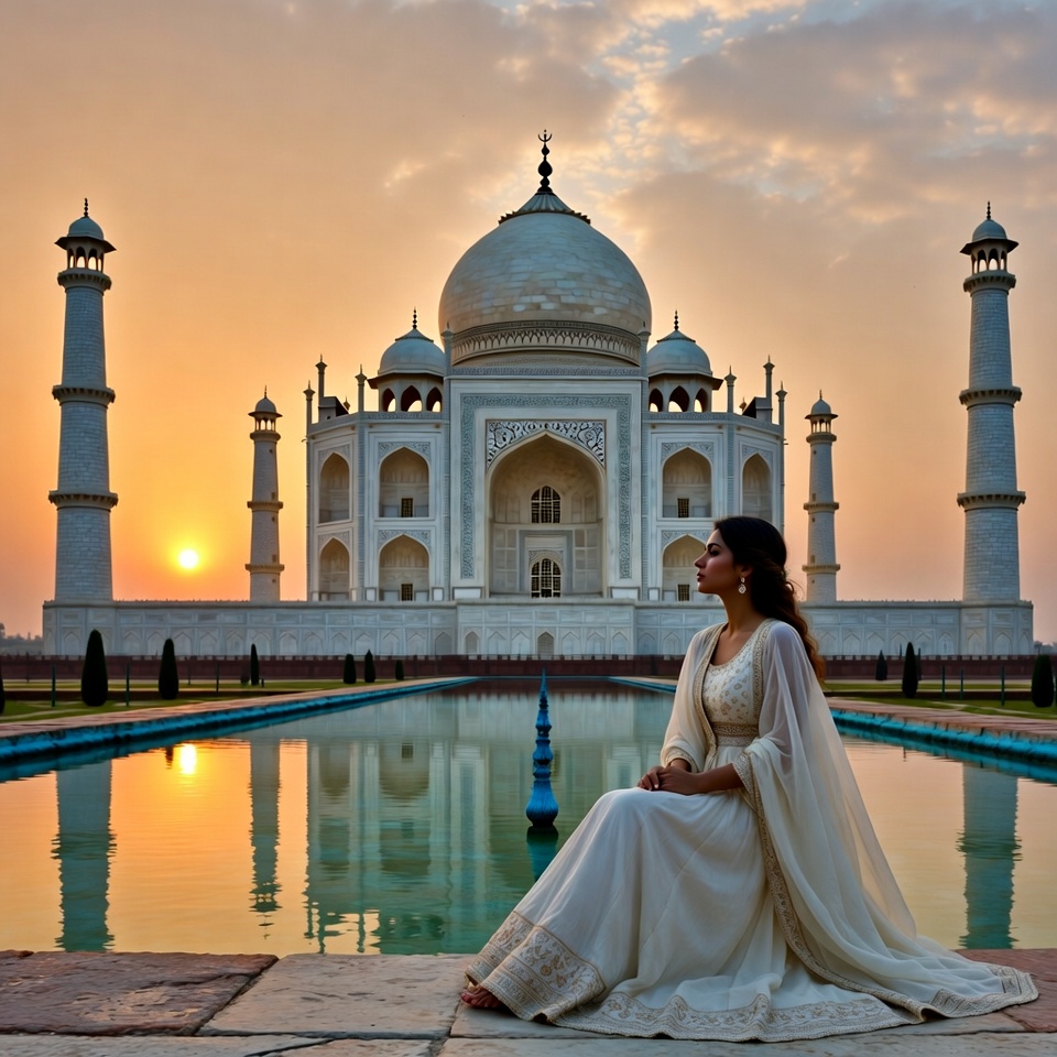 A woman sits by a water pool in front of the Taj Mahal during sunset, wearing traditional clothing. The sun sets behind the iconic monument.