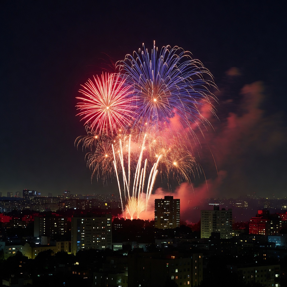 Fireworks light up the night sky above buildings in a city during a celebration. Bright colors burst and create a festive atmosphere.