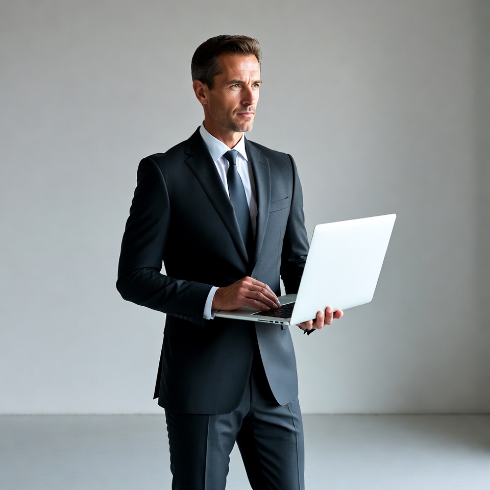 A man in a suit stands holding a laptop while focused on work in a plain indoor space during the day.