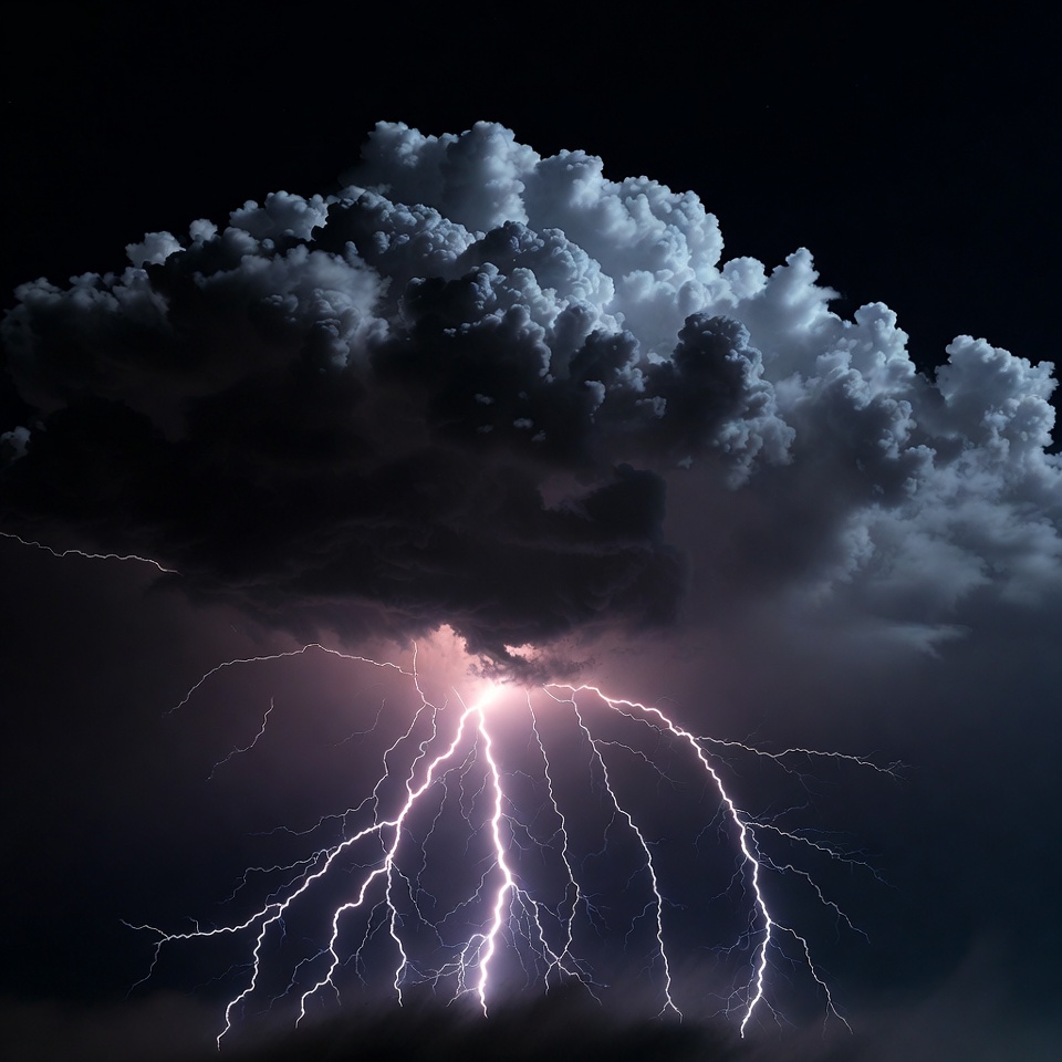 Bright lightning bolts flash through dark clouds in the night sky. A storm brings strong winds and heavy rain to the area.