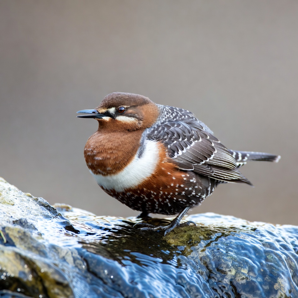 animal, animal behavior, beak, bird, black, brown, ecosystem, feather, habitat, nature, observation, outdoor, perch, rock, small, stream, surroundings, water, wildlife, wing