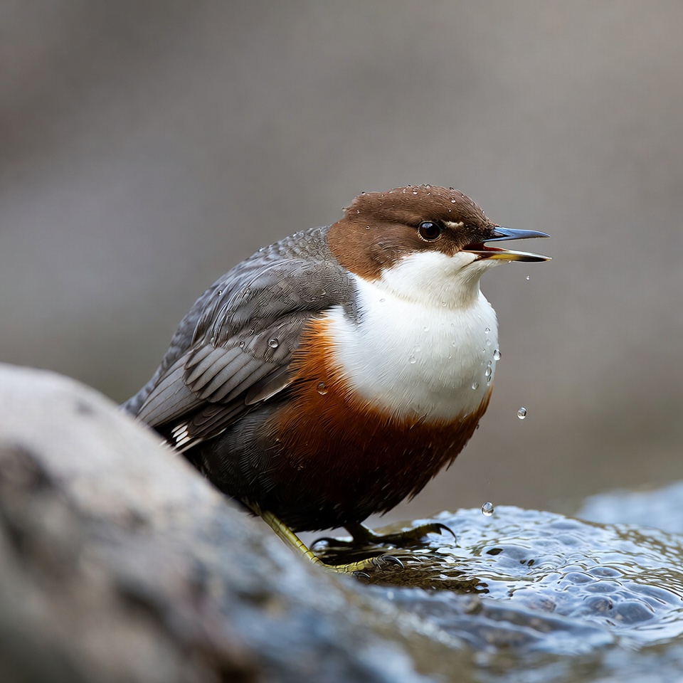 animal, bird, droplet, ecology, environment, feathers, grove, habitat, nature, outdoor, perch, perched, river, rock, scene, singing, sound, stream, water, wildlife