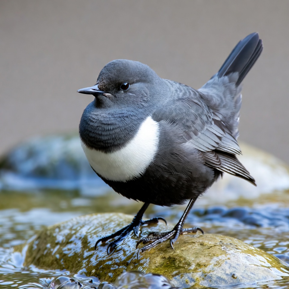 A small bird with gray feathers and a white chest stands on a rock at the edge of a stream. Water flows gently around it.