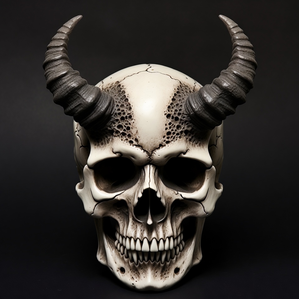 A skull with prominent horns sits against a dark background. It has a detailed design with cracks and texture, creating a striking visual.