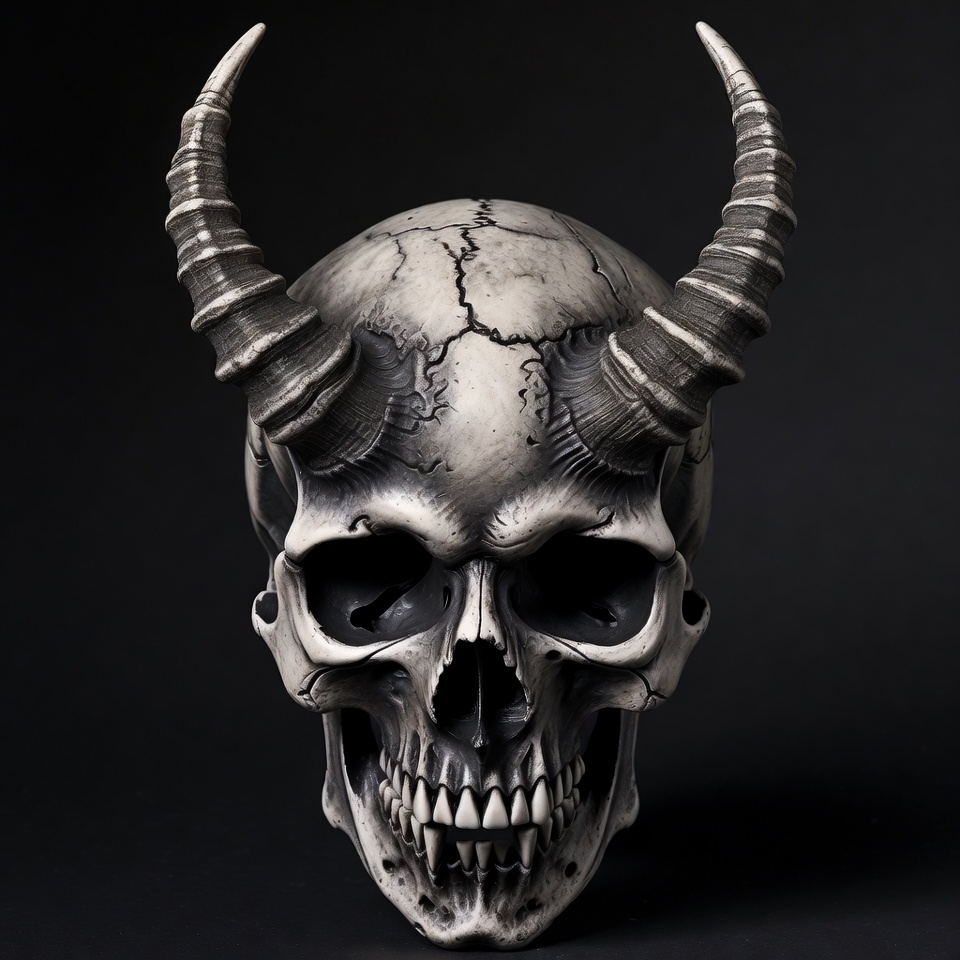 Halloween, art display, black background, bone structure, cracks, craftsmanship, dark art, decorative piece, detailed design, eerie decoration, gothic decor, horns, horror theme, macabre, museum display, occult symbol, sculpture, skull, spooky, teeth
