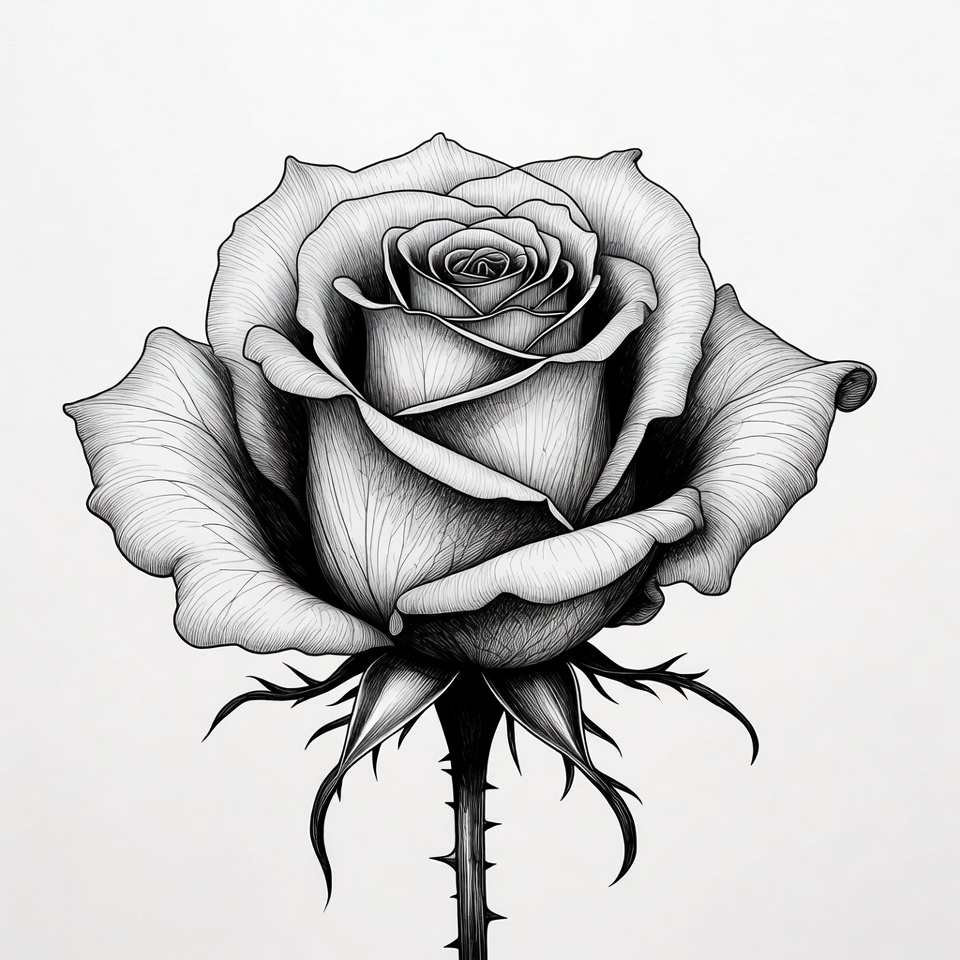 A close-up of a black and white drawing of a rose with intricate details showing every petal and thorn on the stem.