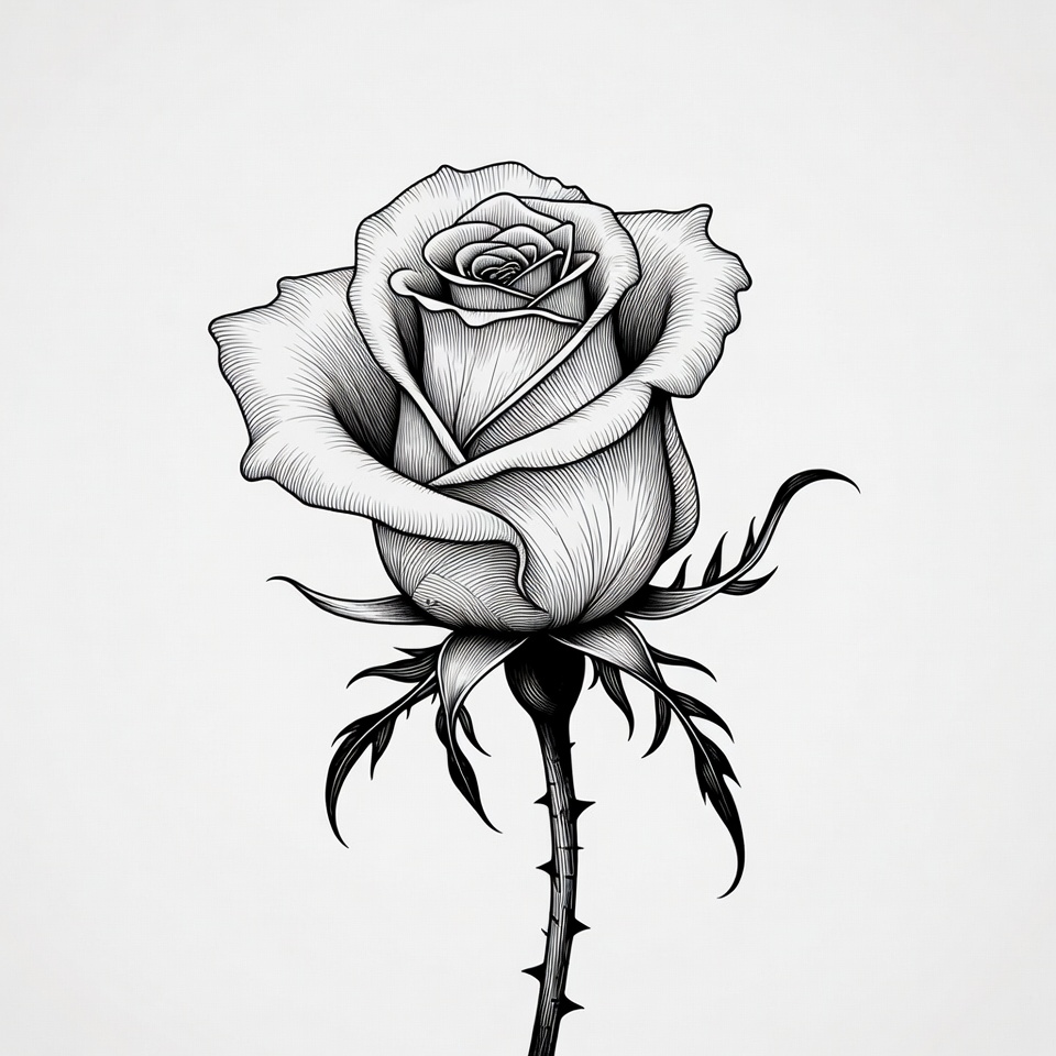 A black and white drawing shows a rose with intricate details. The stem has thorns and the petals are finely designed with dark outlines.