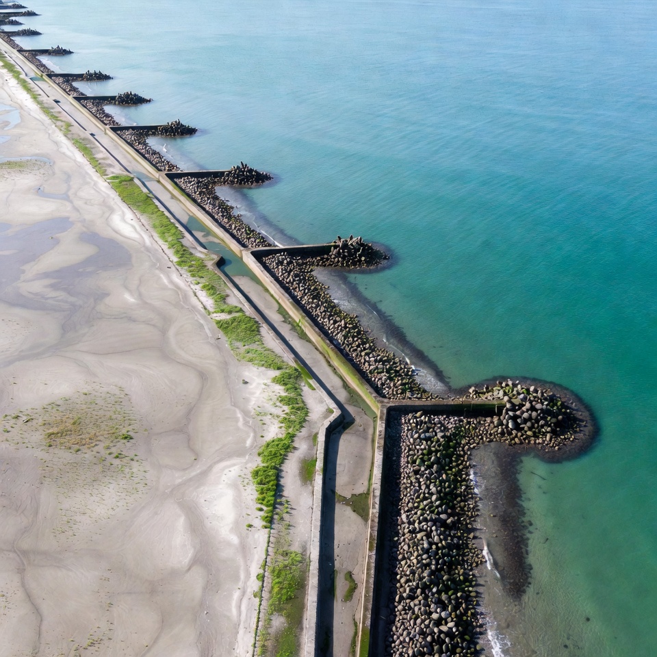Coastal view of breakwaters and beach