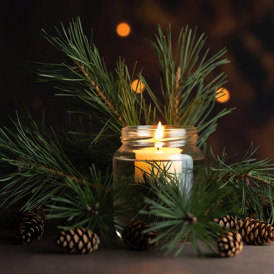 A candle burns softly inside a jar surrounded by pine branches and cones. Light glows from the candle in a dark setting.