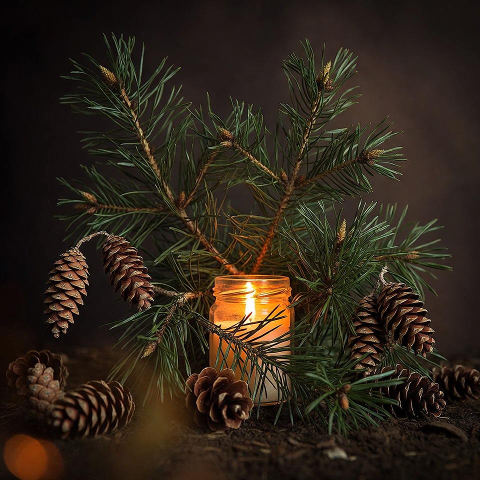A candle is placed among green pine branches and cones. The scene is dimly lit, creating a cozy atmosphere with natural elements.