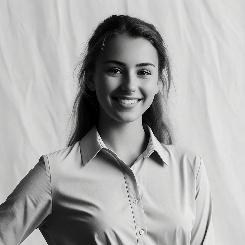 A woman smiles confidently while wearing a button-up shirt. She stands against a textured background, creating a simple yet engaging scene.