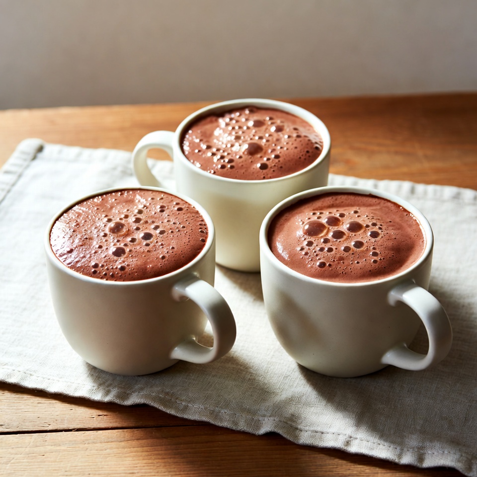 Three cups of hot chocolate sit on a cloth napkin on a wooden table. Bubbles form on the surface of each drink in daylight.