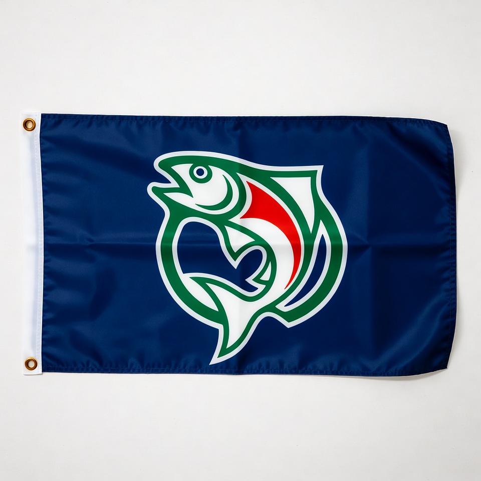 artwork, banner, blue, colors, decoration, design, display, emblem, fabric, fish, flag, graphic, green, identity, marine, nautical, outdoor, red, sign, symbol