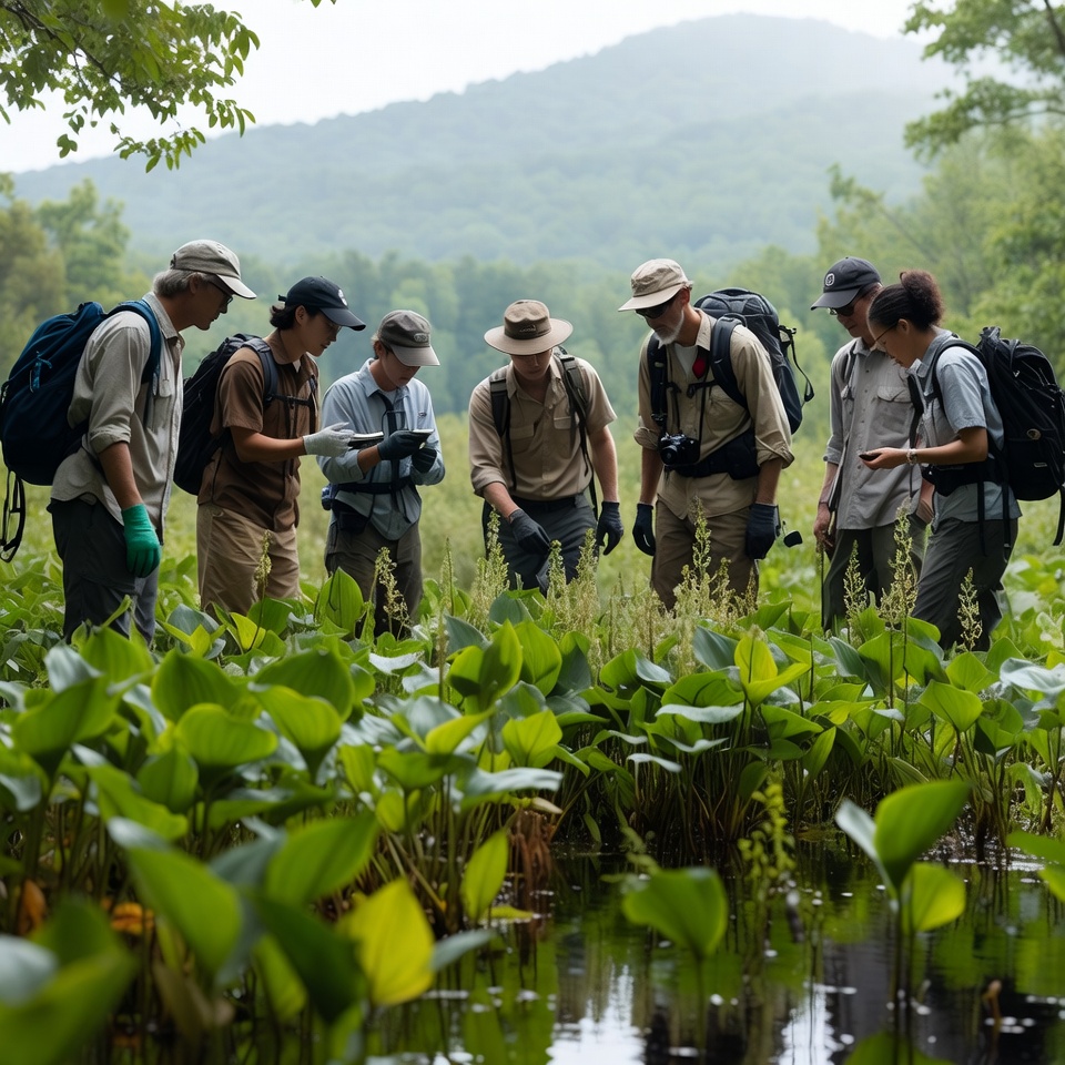 A group of people studies plants near water in a forest. They look focused on their activity and share thoughts in a green setting.