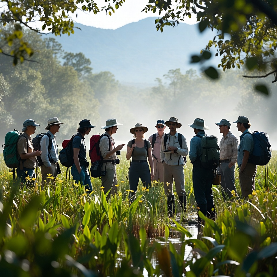 activity, adventure, conservation, education, environment, exploration, gathering, group, guides, hiking, learning, mountains, nature, outdoor, people, plants, session, sun, teamwork, wetlands