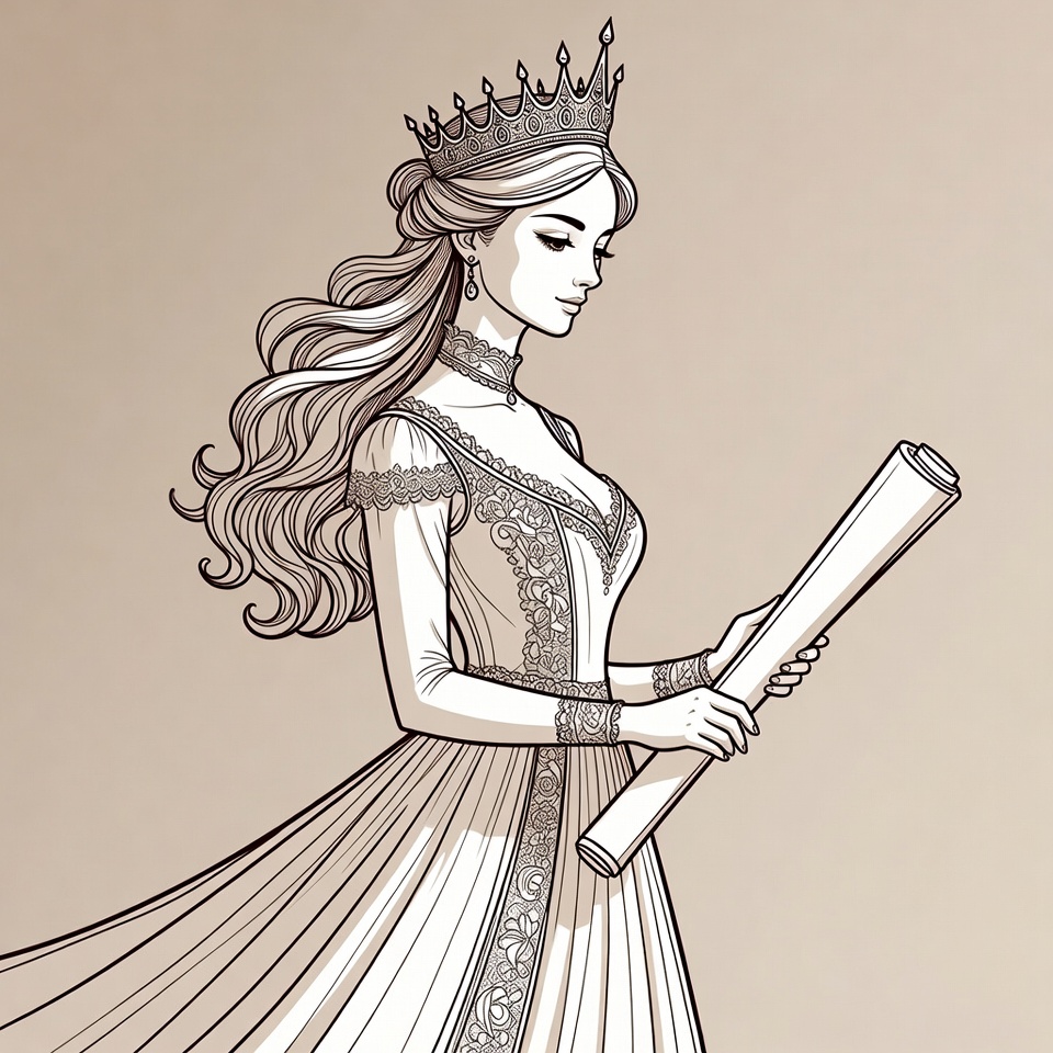 A woman in a royal dress stands holding a scroll. Her long hair flows elegantly, and she wears a crown on her head, showing her regal appearance.