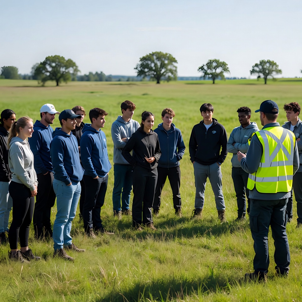 A group of students listens to an instructor while standing on grass in a field under a clear sky. They appear engaged in the discussion.