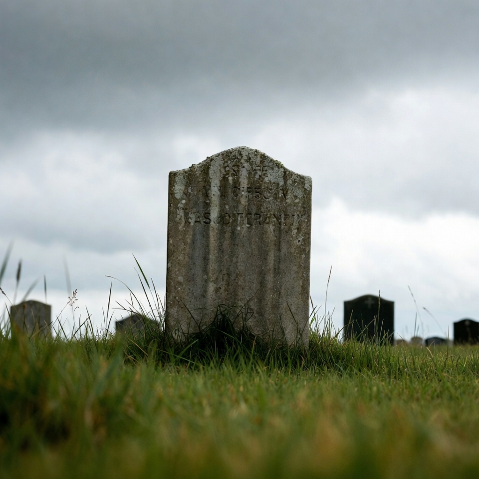 A gravestone stands in a cemetery. The sky is cloudy and gray, and the grass around the stone is green and tall.