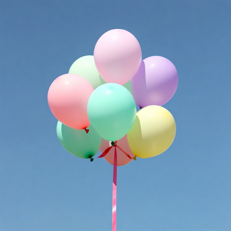 A cluster of pastel-colored balloons floats against a clear blue sky. The balloons include shades of pink, mint green, lavender, and yellow, all tied together with a thin pink string dangling below. They are arranged in a tight bunch, creating a vibrant and festive display.