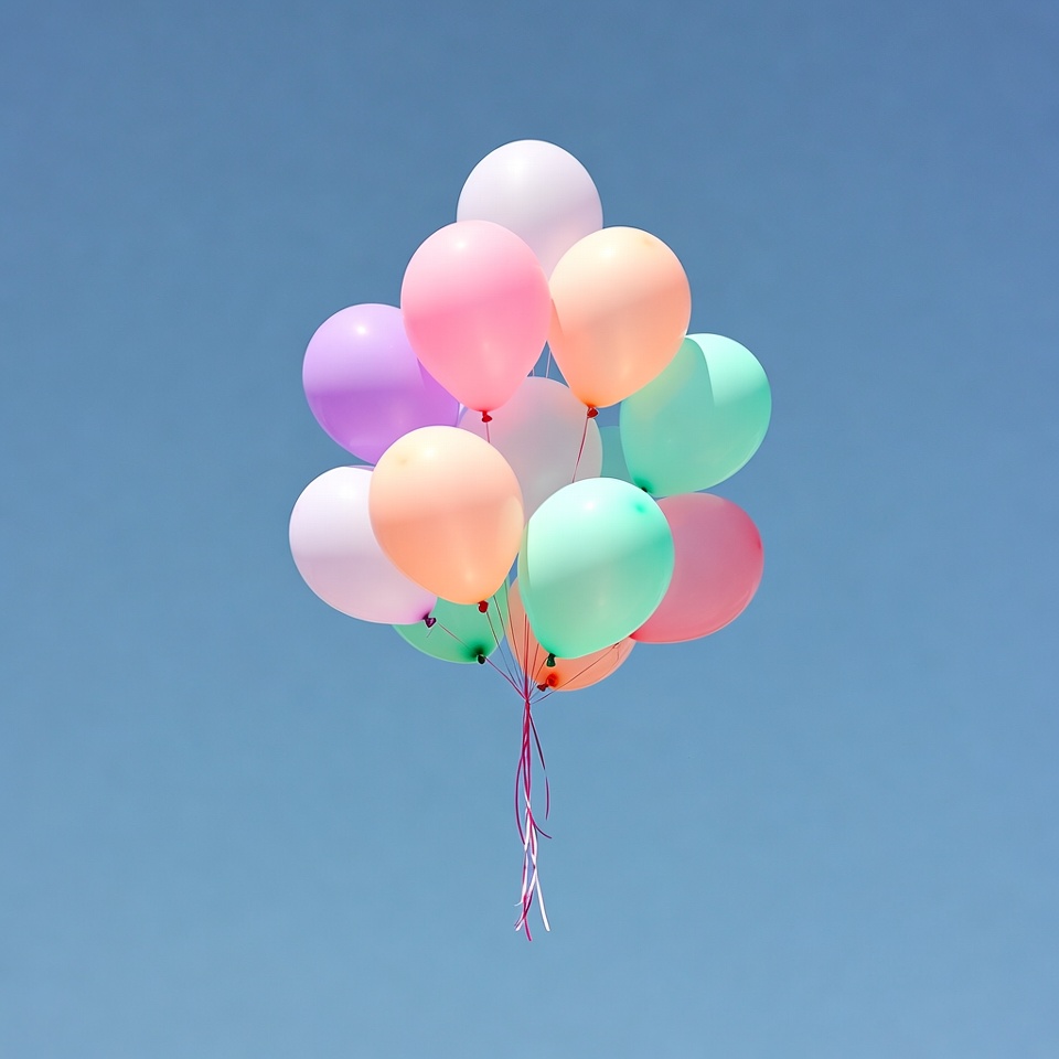 A cluster of pastel-colored balloons floats against a clear blue sky. The balloons include shades of pink, orange, green, purple, and white, tied together with red strings dangling below. They are arranged in a bouquet shape, isolated on the bright background.