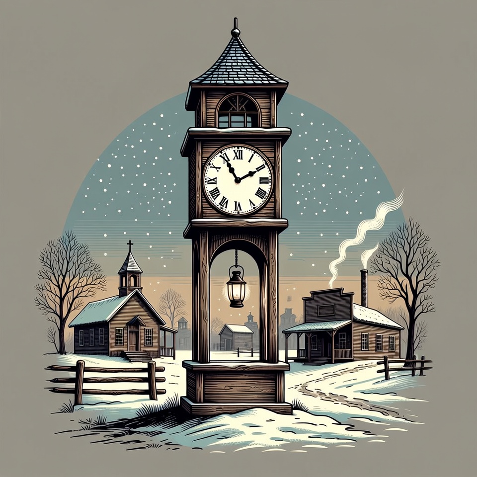 A detailed illustration features a tall wooden clock tower with a white clock face centered in a snowy winter village scene. Surrounding it are small wooden church and buildings with snow-covered roofs, bare trees, a lantern hanging from the tower, and a picket fence along a snowy path. The background shows a starry sky with subtle snowflakes.