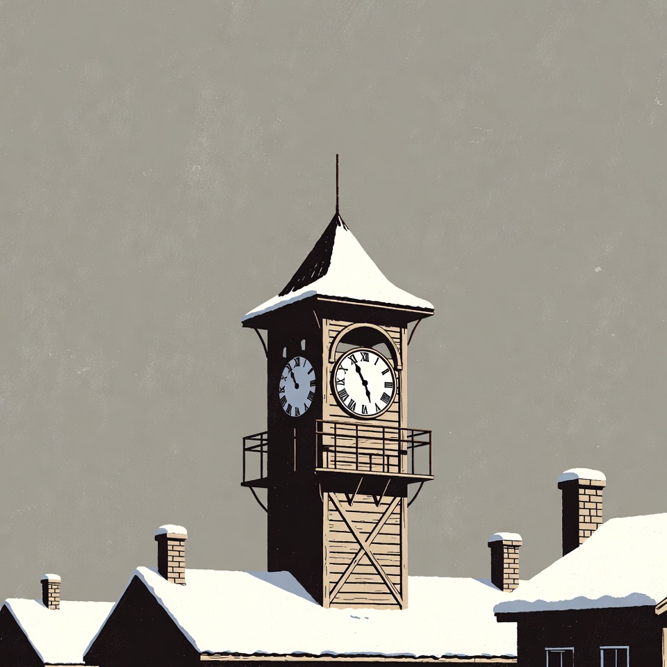 architecture, building, chimneys, clock face, cold weather, gray sky, illustration, peaked roof, rooftops, snow, snow-covered, snowy, tower, white clock, winter, wooden tower, clock tower