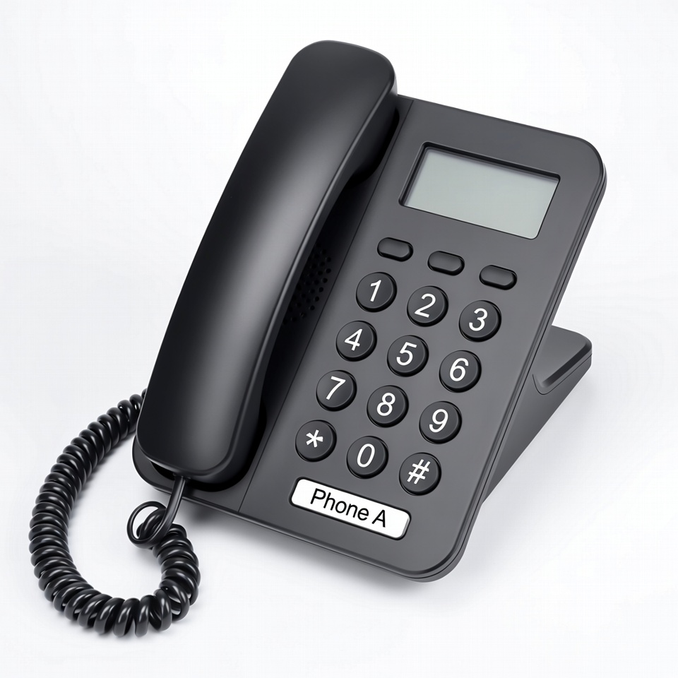 Phone A, black phone, coiled cord, communication device, corded phone, desk phone, digital display, handset, isolated background, keypad, landline, numeric keypad, office phone, phone, telephone