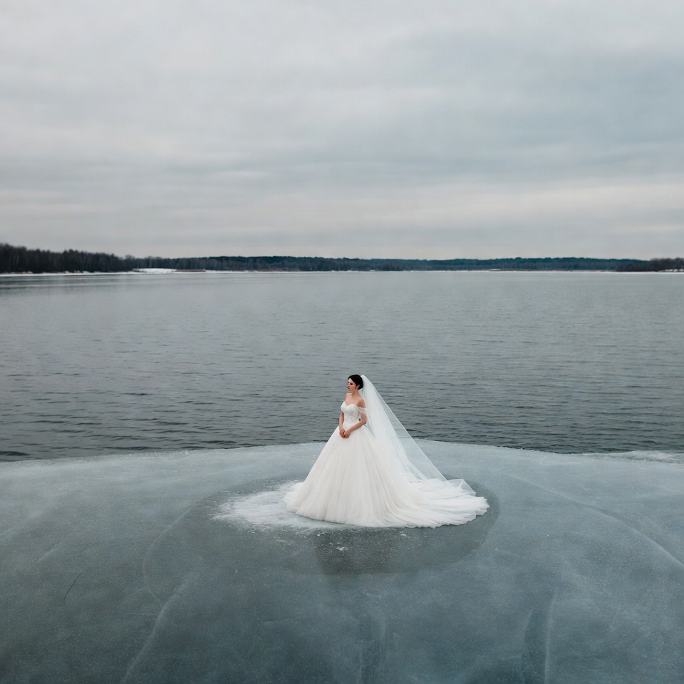 A bride in a long white wedding gown with a flowing veil stands gracefully on a frozen lake. The expansive icy surface stretches out to a distant forested shoreline under a cloudy gray sky. Her dress spreads elegantly over the textured ice.