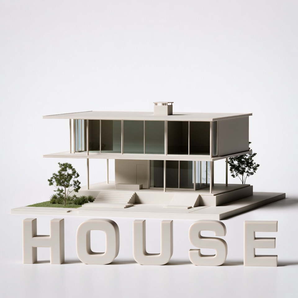 A small-scale white architectural model of a modern house features large glass windows, a flat roof, chimney, overhanging balcony, and steps. Surrounding trees and grass are placed on a base platform. Bold white 'HOUSE' letters stand in front of the model on a plain background.