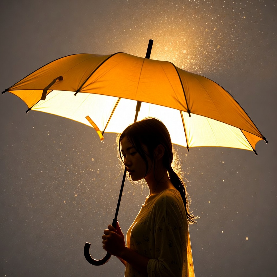 A young Asian woman with long hair in a ponytail holds a glowing yellow umbrella in a dramatic silhouette. Light shines brightly from within the umbrella against a dark gray background with sparkling effects. She stands wearing a light-colored top, gazing downward.
