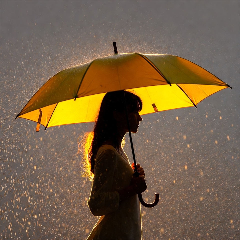 A silhouette of a woman with long wavy hair stands in the rain, holding a large yellow umbrella. She wears a light-colored long-sleeve top and gazes sideways. Raindrops are visible around her against a dark background with warm light highlighting the umbrella.