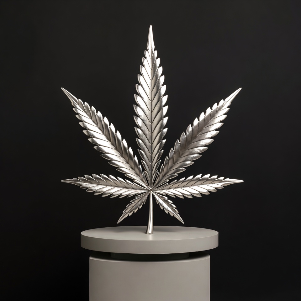A metallic silver cannabis leaf with detailed serrated edges stands prominently on a white cylindrical pedestal. The leaf features a realistic five-pointed structure and glossy metallic finish. It is isolated against a solid black background.