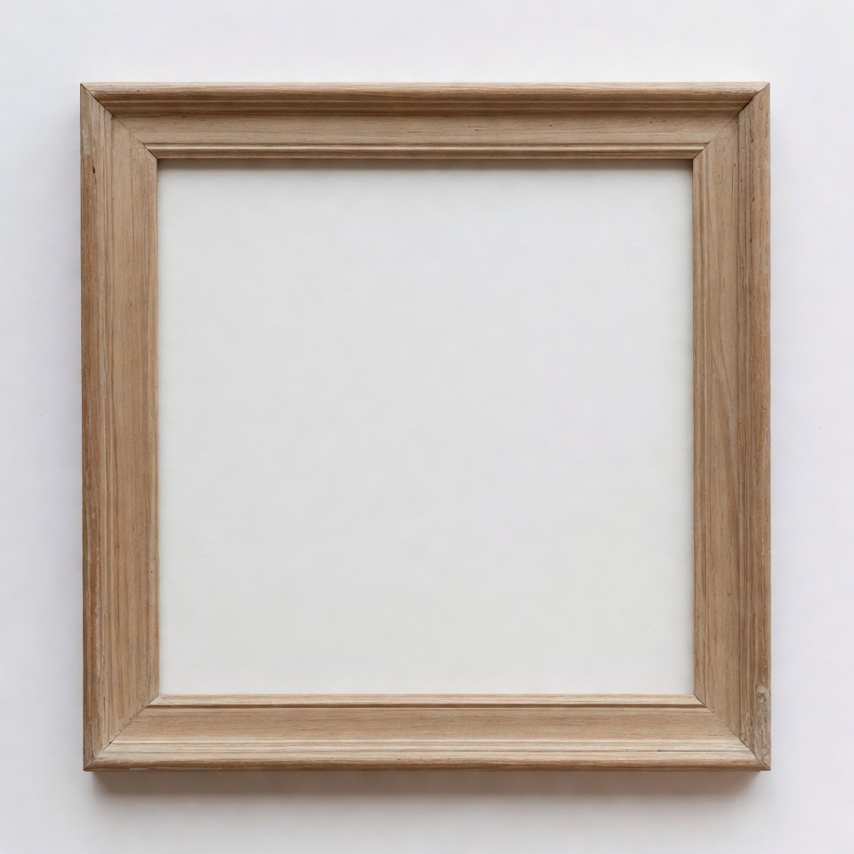 A square wooden picture frame with ornate edges stands on a white background. The frame is made of light-colored wood with detailed molding. The interior is completely empty and white.