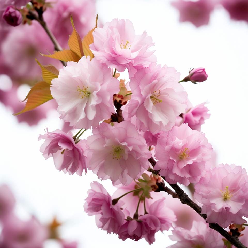 Japanese cherry, blooming, blossoms, branches, close-up, floral, flower buds, green leaves, isolated, leaves, nature, orange leaves, petals, pink flowers, sakura, spring flowers, white background, cherry blossom