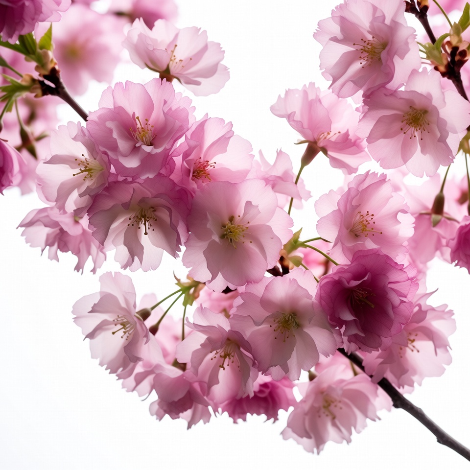 bloom, blossoms, branches, cherry tree, floral, flower cluster, flowering branches, isolated background, nature, petals, pink flowers, sakura, soft pink, spring flowers, stamens, stems, translucent petals, white background, cherry blossoms