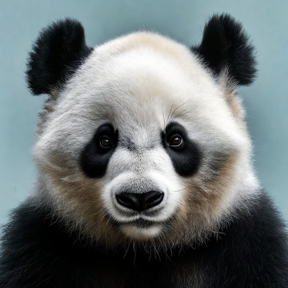 A fluffy panda bear with black ears and eye patches stares directly at the camera. Its white muzzle and black nose are prominently featured against a solid light blue background. The panda's expressive black eyes and soft fur are sharply detailed.
