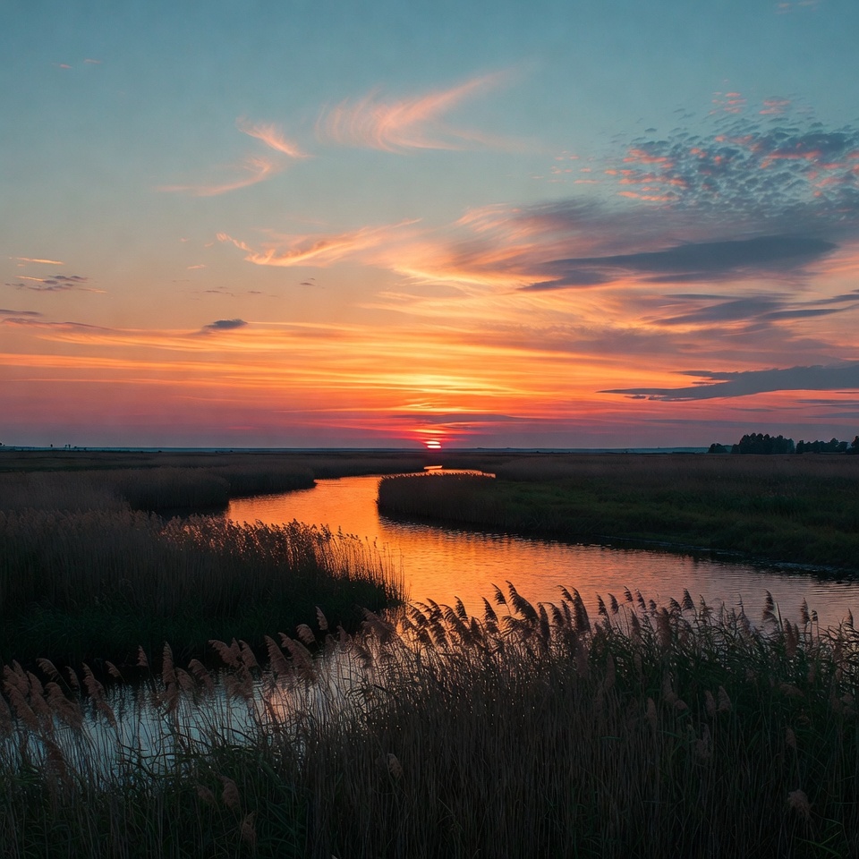 A vibrant sunset with orange and pink skies reflects on a winding river surrounded by tall reeds and marshy grasses. The sun is positioned low in the sky, centered behind the river's curve. The scene features a serene landscape with scattered clouds and golden light illuminating the water and vegetation.