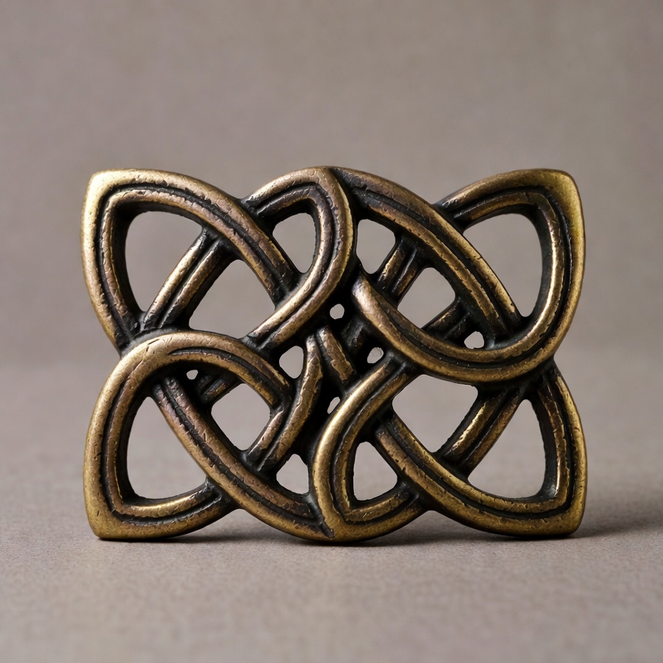 Celtic design, Viking knot, accessory, bronze, buckle, decorative buckle, gold finish, interwoven knots, isolated background, jewelry, knotwork, metal, rectangular buckle, tribal pattern, Celtic knot