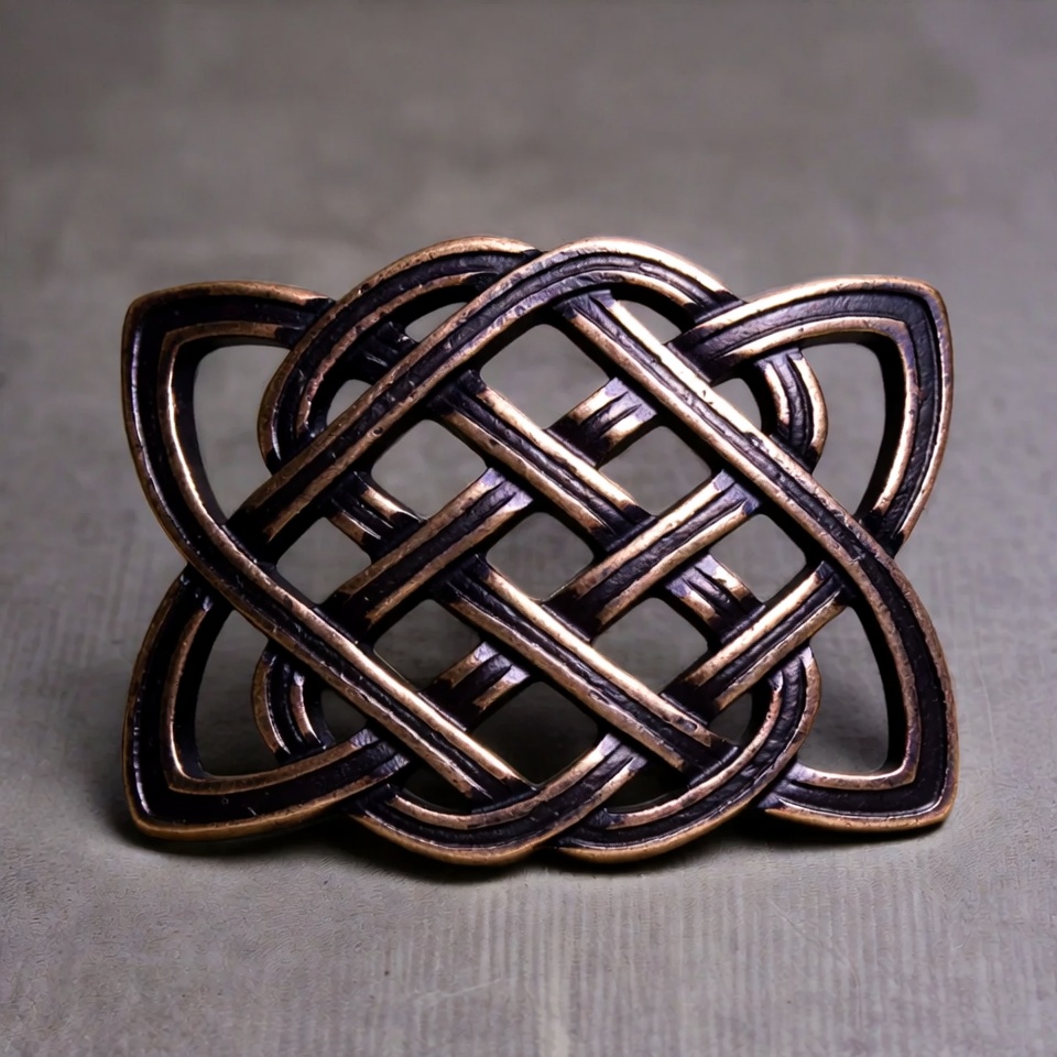 Celtic design, accessory, belt buckle, bronze buckle, bronze metal, dark patina, interwoven pattern, intricate design, isolated background, jewelry, knotwork, metallic, square shape, traditional Celtic, Celtic knot