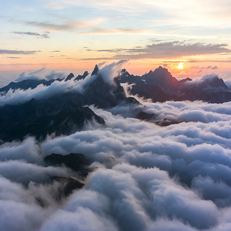 Majestic mountain peaks pierce through thick layers of clouds during a vibrant sunset. The sun glows orange behind the rugged summits, casting warm hues across the sky. Dense fog blankets the lower slopes, creating a dramatic aerial vista.