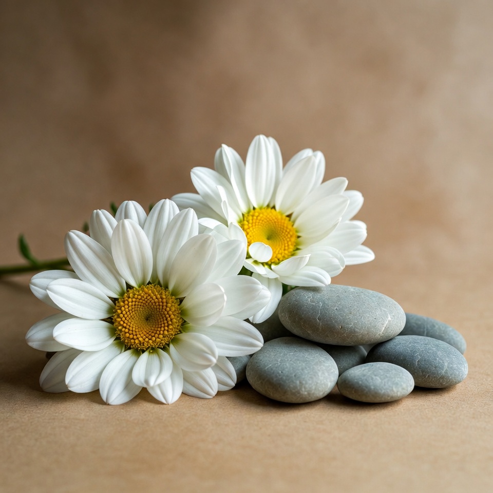 Two white daisies with yellow centers rest on a beige surface next to a cluster of smooth gray pebbles. The flowers have green stems and delicate white petals. The arrangement is simple and isolated against a neutral background.