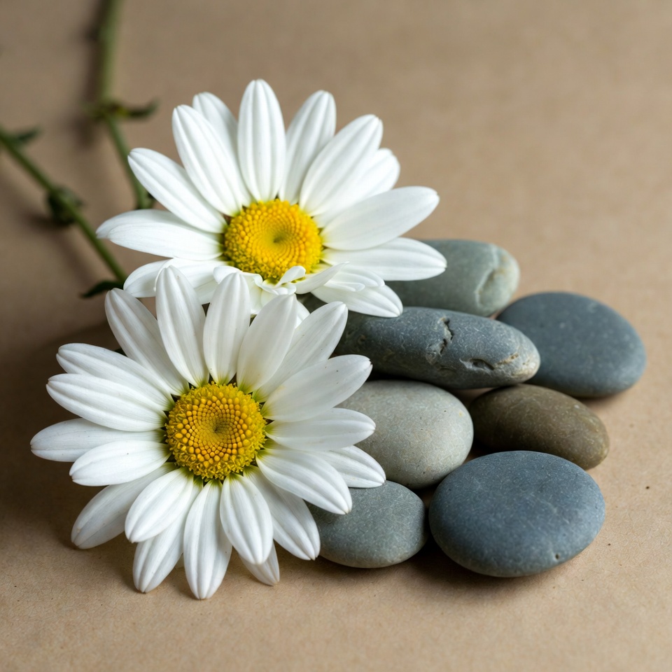 Two white daisies with yellow centers rest on a beige surface alongside a cluster of smooth gray pebbles. Thin green stems extend from the flowers. The composition is simple and isolated against the neutral background.