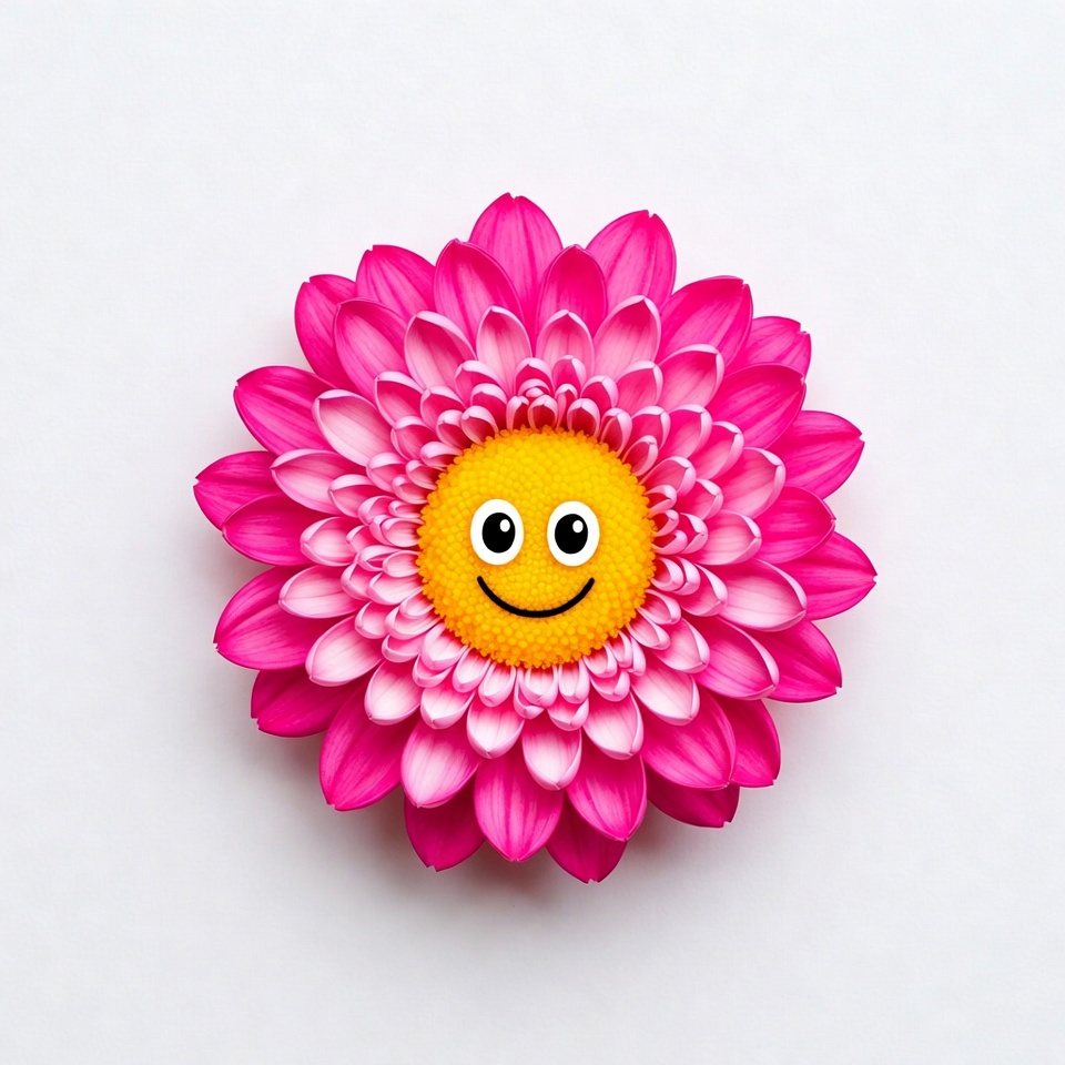 A vibrant pink daisy flower with a cheerful yellow face featuring big eyes and a smiling mouth sits centered on a plain white background. The petals are layered and frilly, surrounding the happy cartoonish face. It appears as a cute illustration or clipart.