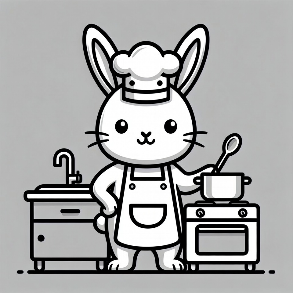A cute cartoon bunny wearing a chef hat and apron stands in a kitchen. It holds a spoon in a pot on the stove next to a sink and cabinets. The image is in black and white line art style on a gray background.